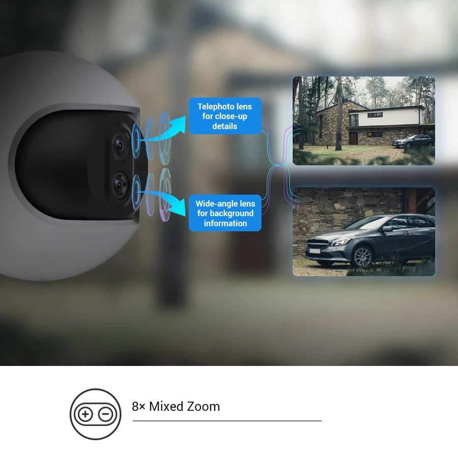 Dual-Lens Design for Mixed Zoom: Features two lenses (2.8mm wide-angle and 12mm telephoto) to offer 8x mixed zoom, allowing for both a panoramic overview and a detailed close-up view simultaneously.