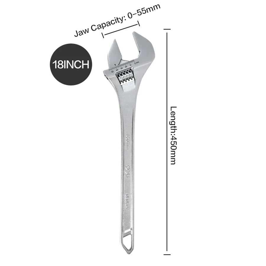 Standard capacity for an 18-inch adjustable wrench. |